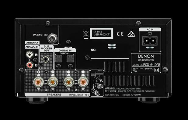 Basato sul pluripremiato D-M40DAB, il nuovo D-M41DAB è caratterizzato da un suono, uno stile e strutture migliori. Il circuito dell'amplificatore analogico discreto di nuova concezione riduce i percorsi del segnale per una maggiore chiarezza e impatto, mentre la nuova implementazione Bluetooth combina la convenienza con un interruttore di spegnimento per ridurre la sua influenza sul suono di altre sorgenti quando non in uso. Nel frattempo, il nuovo design estetico echeggia quello dell'ammiraglia Denon 'NE' si separa. L'unità centrale RCD-M41DAB dispone anche di due ingressi ottici digitali per il collegamento di un televisore, set-top box o altri apparecchi digitali che meritano una migliore qualità audio, e ha incorporato CD più radio FM DAB/DAB+, mentre i nuovi diffusori SC-M41 sono europei Sound Tuned per completare le prestazioni del ricevitore CD.