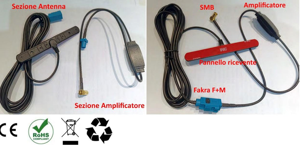 - - Facile passaggio cavo nei cruscotti, senza ingombri, il piccolo amplificatore di segnale si collega direttamente dietro il ricevitore, con un robusto connettore Fakra Maschio/Femmina.