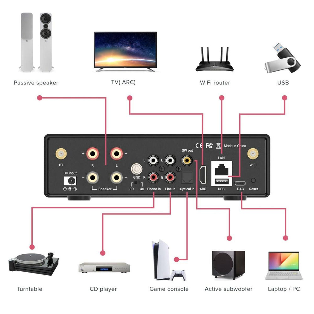 - Ingresso audio: Bluetooth, ingresso linea, ingresso Phono, ingresso ottico, TV ARC, host USB, USB Type-C