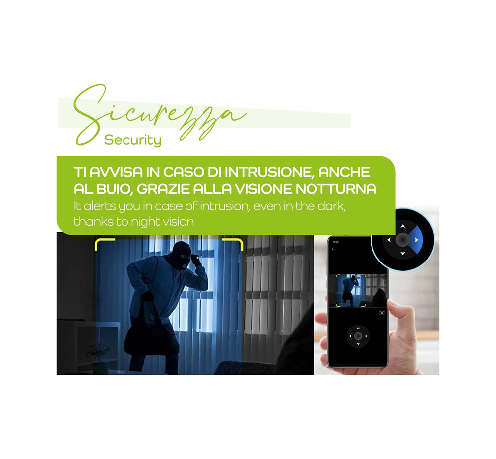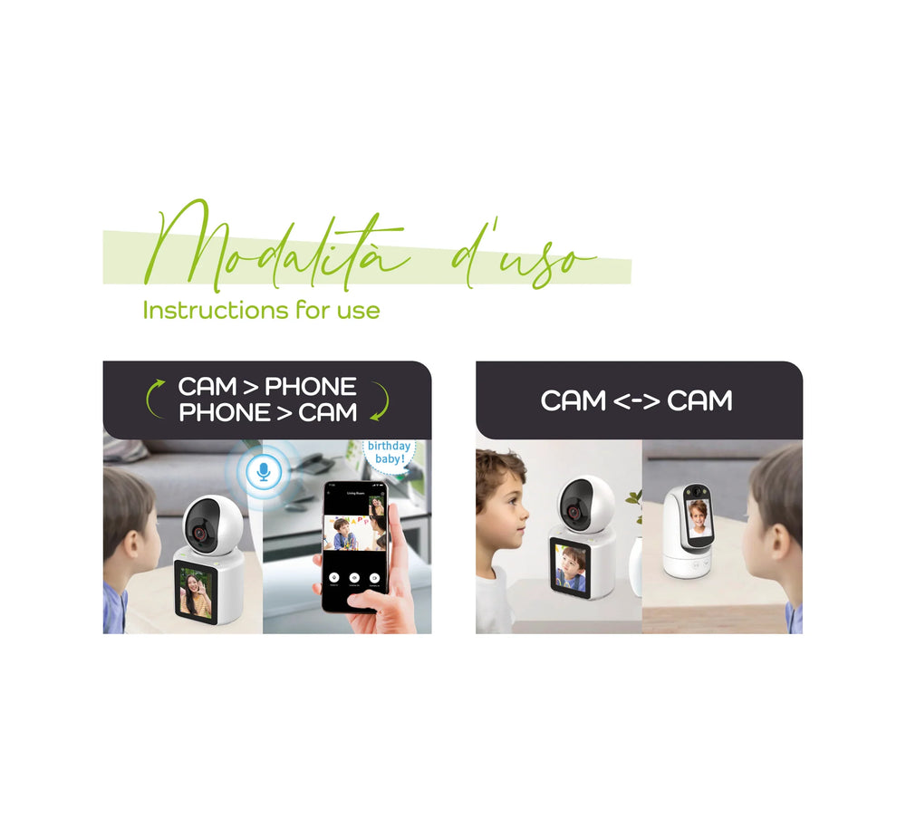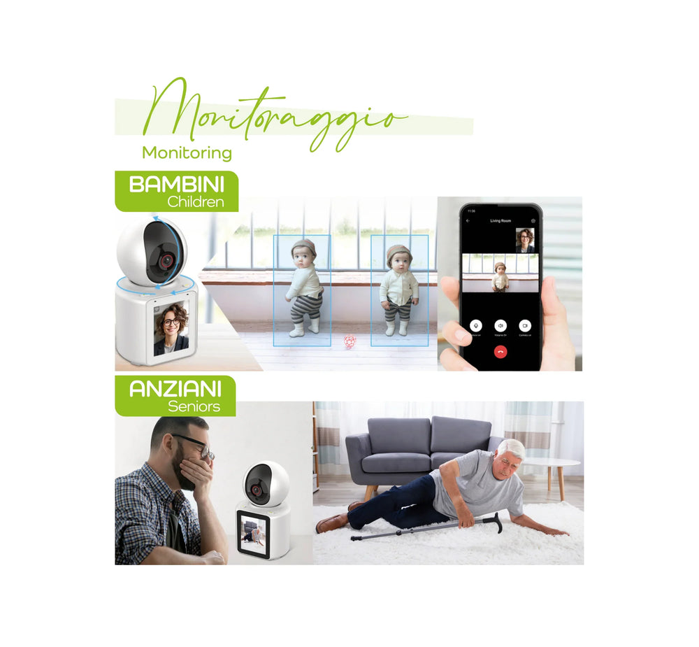 Straordinario prodotto adatto sia alla videosorveglianza che per realizzare videochiamate.Grazie all'applicazione gratuita (Android e IOS), potrete controllare bambini, anziani o ambienti da remoto, ovunque voi siate. In caso di movimento la telecamera registrer? tutto su microSD (non inclusa) a orari stabiliti con possibilit? di attivare un allarme. In alternativa potrete con pochi euro all'anno abbonarvi ad un servizio in cloud che registrer? e metter? al sicuro i vostri filmati. Potrete ascoltare l'audio ambientale, parlare con persone o animali inquadrati e effettuare videochiamate tra smartphone e videocamera.Possiede sia illuminatori a infrarossi (per visione notturna) che led bianchi per illuminare e registrare a colori in caso di necessit?.Acquistando una seconda videocamera potrete effettuare videochiamate tra le due unit? semplicemente premendo un tasto. L'applicazione IM CAM ? in grado di gestire infinite telecamere con la massima facilit?.I modelli CAM 12 e CAM 15 sono compatibili tra loro e con l'applicazione e possiedono funzione di tracciamento automatico di una persona.