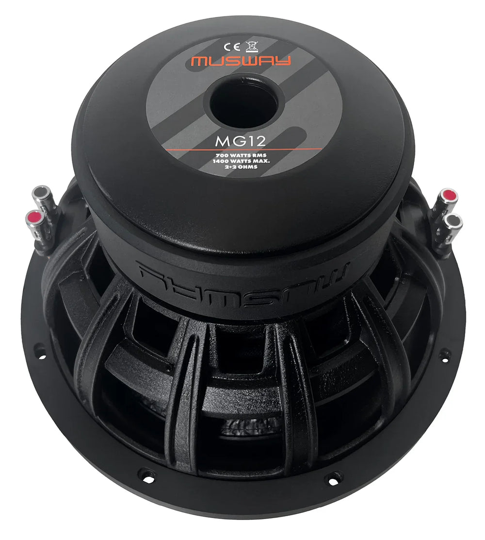 Il subwoofer Musway MG12 da 300mm è studiato per offrire bassi potenti e profondi, gestendo una potenza di picco di 1400W con doppia bobina da 2+2 Ohm. Caratterizzato da un'eccezionale escursione (Xmax +/- 14mm) e una bassa frequenza di risonanza di 30 Hz, assicura prestazioni d'impatto. Questo subwoofer si contraddistingue per la sua costruzione robusta, con cestello in alluminio pressofuso e doppio magnete da 3,4 kg.
