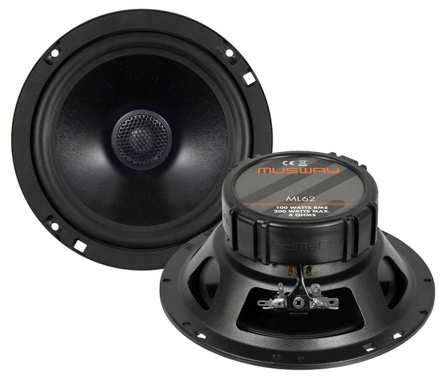 La coppia di altoparlanti coassiali a 2 vie Musway ML62 da 165mm offre 200W di picco (100W RMS) a 4 Ohm hanno il cono in alluminio e tweeter al neodimio da 20mm con una gamma di frequenze da 50 a 25000 Hz.