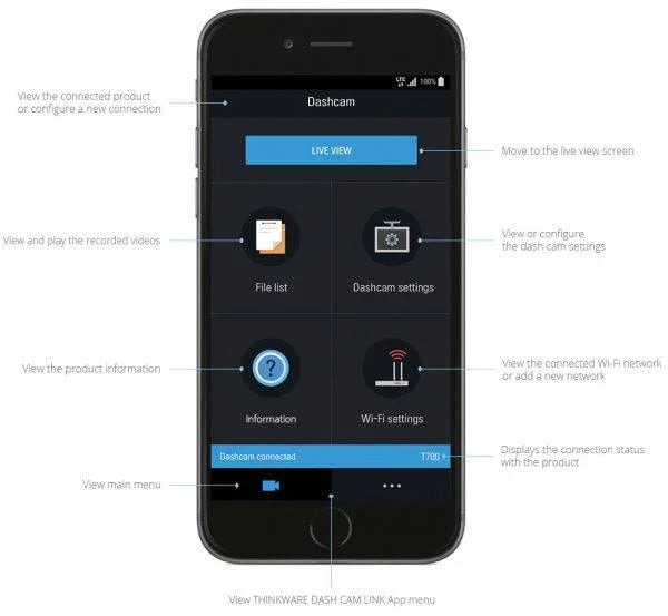 La Thinkware Dash Cam T700 e il tuo smartphone possono essere collegati tramite l’app “THINKWARE DASH CAM LINK” con Wi-Fi integrato. Controlla la schermata della visualizzazione live, riproduci i video registrati e gestisci le impostazioni della dash cam.